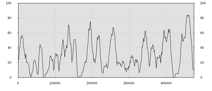 (по горизонтали: счётчик знаков; по вертикали: процент диалогов; размер скользящего окна: знаков, шаг: 1000 знаков) |