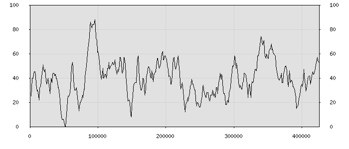 (по горизонтали: счётчик знаков; по вертикали: процент диалогов; размер скользящего окна: знаков, шаг: 1000 знаков) |