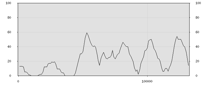 (по горизонтали: счётчик знаков; по вертикали: процент диалогов; размер скользящего окна: знаков, шаг: 1000 знаков) |