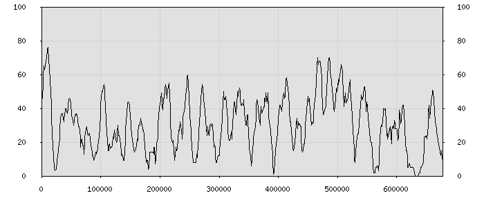 (по горизонтали: счётчик знаков; по вертикали: процент диалогов; размер скользящего окна: знаков, шаг: 1000 знаков) |