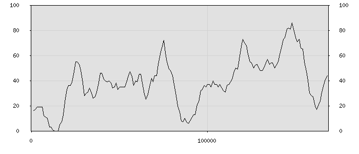 (по горизонтали: счётчик знаков; по вертикали: процент диалогов; размер скользящего окна: знаков, шаг: 1000 знаков) |