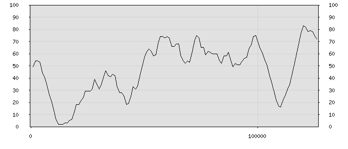 (по горизонтали: счётчик знаков; по вертикали: процент диалогов; размер скользящего окна: знаков, шаг: 1000 знаков) |