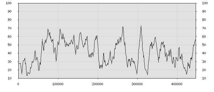 (по горизонтали: счётчик знаков; по вертикали: процент диалогов; размер скользящего окна: знаков, шаг: 1000 знаков) |