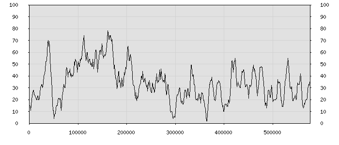 (по горизонтали: счётчик знаков; по вертикали: процент диалогов; размер скользящего окна: знаков, шаг: 1000 знаков) |