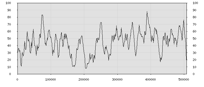 (по горизонтали: счётчик знаков; по вертикали: процент диалогов; размер скользящего окна: знаков, шаг: 1000 знаков) |