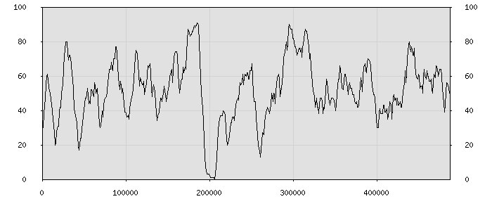 (по горизонтали: счётчик знаков; по вертикали: процент диалогов; размер скользящего окна: знаков, шаг: 1000 знаков) |