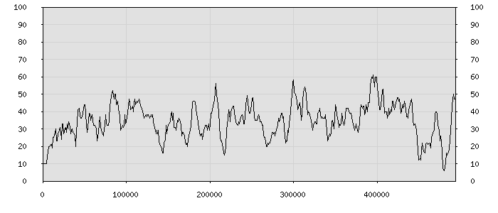 (по горизонтали: счётчик знаков; по вертикали: процент диалогов; размер скользящего окна: знаков, шаг: 1000 знаков) |