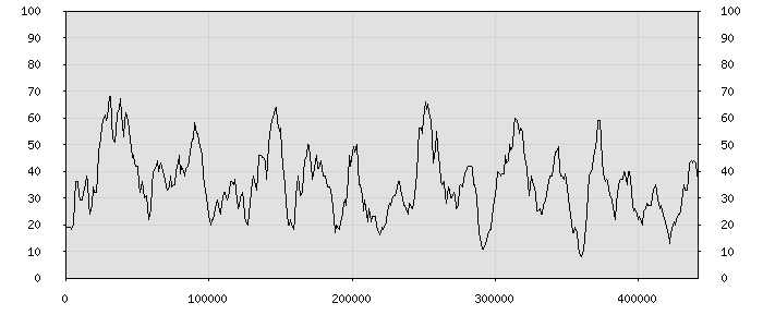 (по горизонтали: счётчик знаков; по вертикали: процент диалогов; размер скользящего окна: знаков, шаг: 1000 знаков) |
