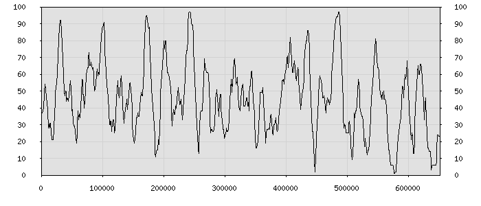 (по горизонтали: счётчик знаков; по вертикали: процент диалогов; размер скользящего окна: знаков, шаг: 1000 знаков) |