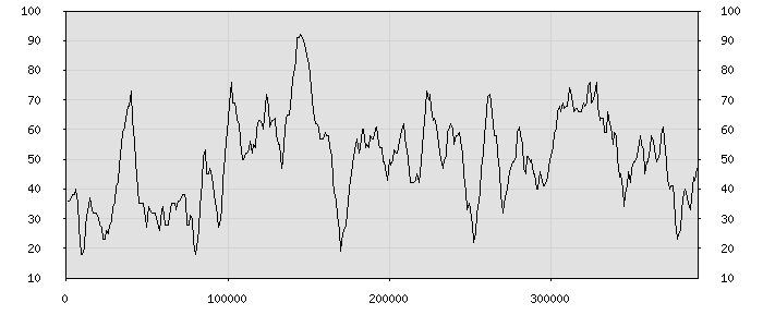 (по горизонтали: счётчик знаков; по вертикали: процент диалогов; размер скользящего окна: знаков, шаг: 1000 знаков) |