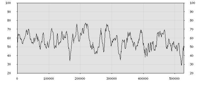 (по горизонтали: счётчик знаков; по вертикали: процент диалогов; размер скользящего окна: знаков, шаг: 1000 знаков) |
