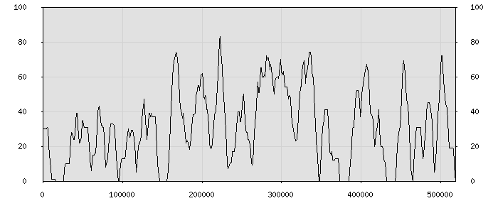 (по горизонтали: счётчик знаков; по вертикали: процент диалогов; размер скользящего окна: знаков, шаг: 1000 знаков) |