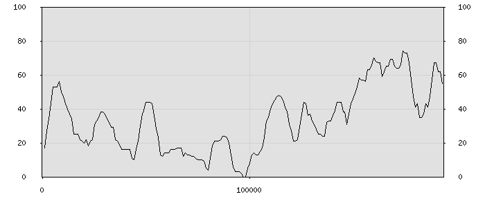 (по горизонтали: счётчик знаков; по вертикали: процент диалогов; размер скользящего окна: знаков, шаг: 1000 знаков) |