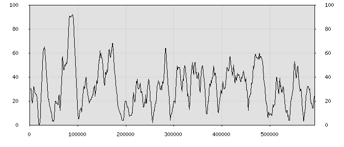 (по горизонтали: счётчик знаков; по вертикали: процент диалогов; размер скользящего окна: знаков, шаг: 1000 знаков) |