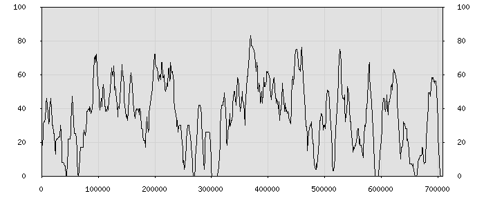 (по горизонтали: счётчик знаков; по вертикали: процент диалогов; размер скользящего окна: знаков, шаг: 1000 знаков) |