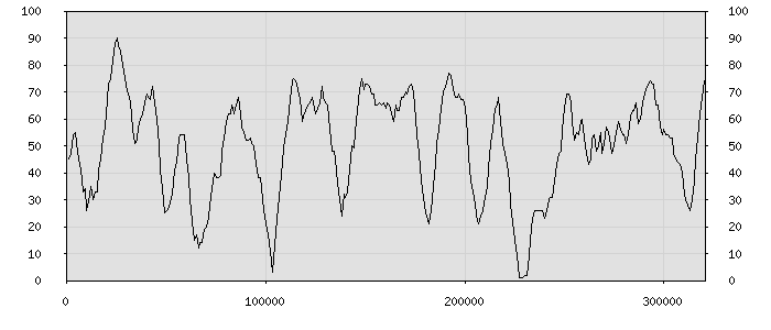 (по горизонтали: счётчик знаков; по вертикали: процент диалогов; размер скользящего окна: знаков, шаг: 1000 знаков) |