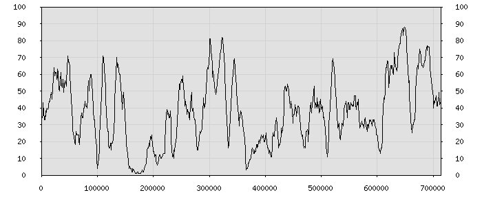 (по горизонтали: счётчик знаков; по вертикали: процент диалогов; размер скользящего окна: знаков, шаг: 1000 знаков) |