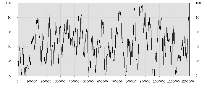 (по горизонтали: счётчик знаков; по вертикали: процент диалогов; размер скользящего окна: знаков, шаг: 1000 знаков) |