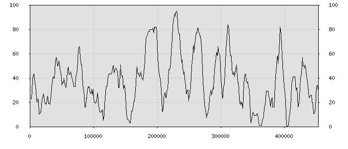 (по горизонтали: счётчик знаков; по вертикали: процент диалогов; размер скользящего окна: знаков, шаг: 1000 знаков) |