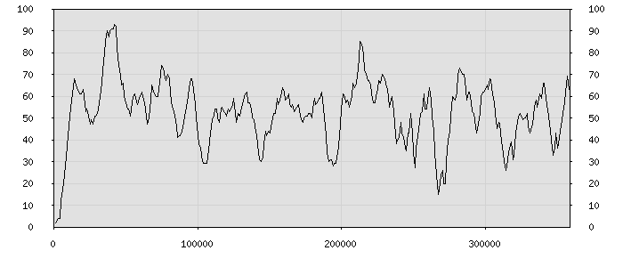 (по горизонтали: счётчик знаков; по вертикали: процент диалогов; размер скользящего окна: знаков, шаг: 1000 знаков) |