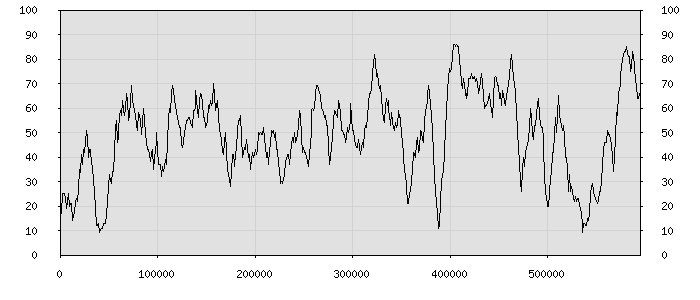 (по горизонтали: счётчик знаков; по вертикали: процент диалогов; размер скользящего окна: знаков, шаг: 1000 знаков) |