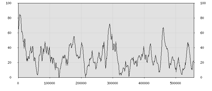 (по горизонтали: счётчик знаков; по вертикали: процент диалогов; размер скользящего окна: знаков, шаг: 1000 знаков) |