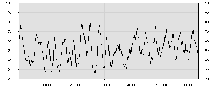 (по горизонтали: счётчик знаков; по вертикали: процент диалогов; размер скользящего окна: знаков, шаг: 1000 знаков) |
