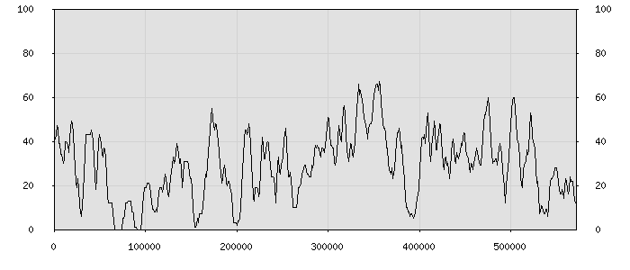 (по горизонтали: счётчик знаков; по вертикали: процент диалогов; размер скользящего окна: знаков, шаг: 1000 знаков) |