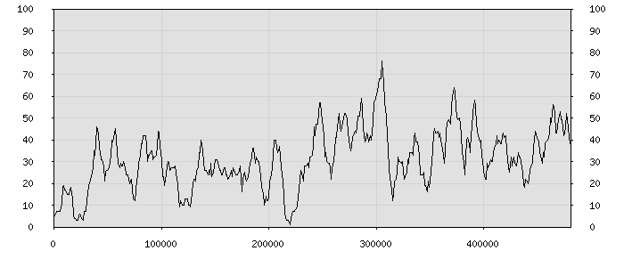 (по горизонтали: счётчик знаков; по вертикали: процент диалогов; размер скользящего окна: знаков, шаг: 1000 знаков) |