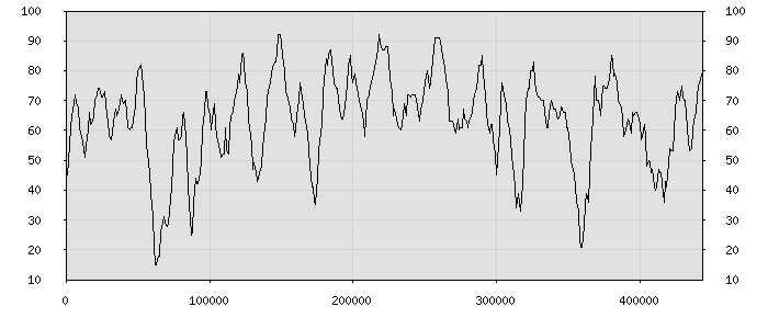 (по горизонтали: счётчик знаков; по вертикали: процент диалогов; размер скользящего окна: знаков, шаг: 1000 знаков) |