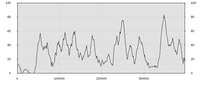 (по горизонтали: счётчик знаков; по вертикали: процент диалогов; размер скользящего окна: знаков, шаг: 1000 знаков) |