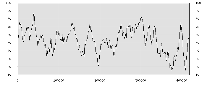 (по горизонтали: счётчик знаков; по вертикали: процент диалогов; размер скользящего окна: знаков, шаг: 1000 знаков) |