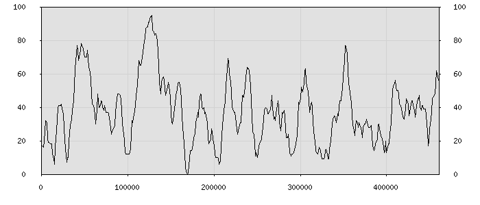 (по горизонтали: счётчик знаков; по вертикали: процент диалогов; размер скользящего окна: знаков, шаг: 1000 знаков) |
