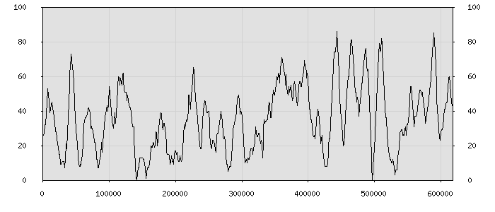 (по горизонтали: счётчик знаков; по вертикали: процент диалогов; размер скользящего окна: знаков, шаг: 1000 знаков) |