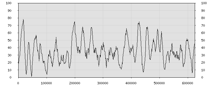 (по горизонтали: счётчик знаков; по вертикали: процент диалогов; размер скользящего окна: знаков, шаг: 1000 знаков) |