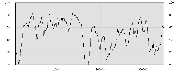 (по горизонтали: счётчик знаков; по вертикали: процент диалогов; размер скользящего окна: знаков, шаг: 1000 знаков) |