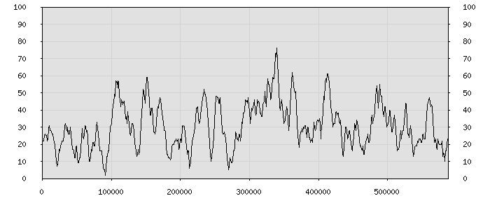 (по горизонтали: счётчик знаков; по вертикали: процент диалогов; размер скользящего окна: знаков, шаг: 1000 знаков) |