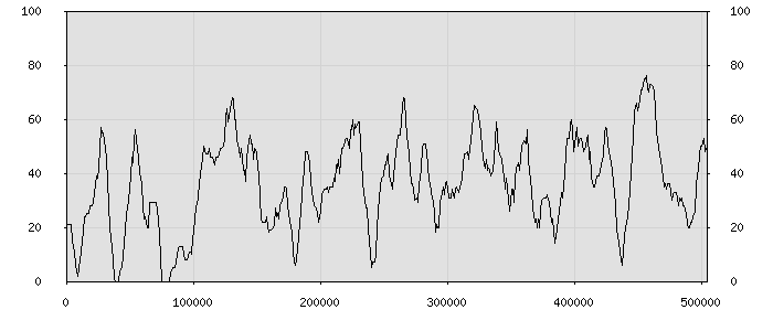 (по горизонтали: счётчик знаков; по вертикали: процент диалогов; размер скользящего окна: знаков, шаг: 1000 знаков) |