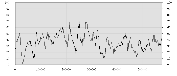 (по горизонтали: счётчик знаков; по вертикали: процент диалогов; размер скользящего окна: знаков, шаг: 1000 знаков) |