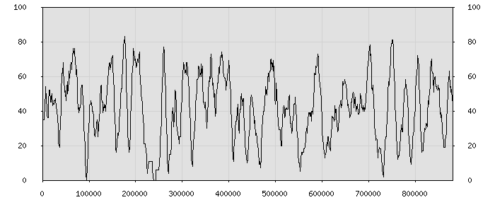 (по горизонтали: счётчик знаков; по вертикали: процент диалогов; размер скользящего окна: знаков, шаг: 1000 знаков) |