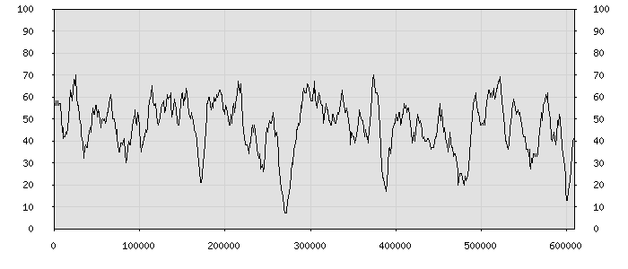 (по горизонтали: счётчик знаков; по вертикали: процент диалогов; размер скользящего окна: знаков, шаг: 1000 знаков) |