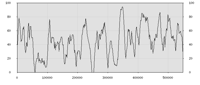 (по горизонтали: счётчик знаков; по вертикали: процент диалогов; размер скользящего окна: знаков, шаг: 1000 знаков) |