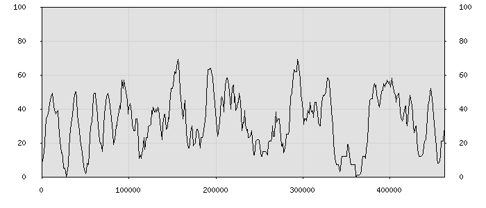 (по горизонтали: счётчик знаков; по вертикали: процент диалогов; размер скользящего окна: знаков, шаг: 1000 знаков) |