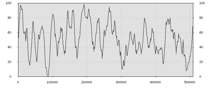 (по горизонтали: счётчик знаков; по вертикали: процент диалогов; размер скользящего окна: знаков, шаг: 1000 знаков) |