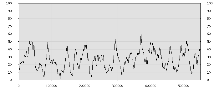 (по горизонтали: счётчик знаков; по вертикали: процент диалогов; размер скользящего окна: знаков, шаг: 1000 знаков) |