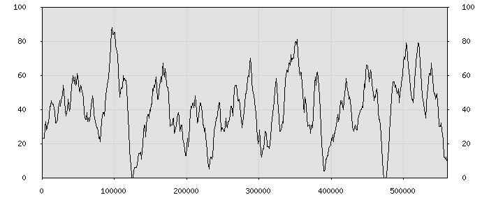 (по горизонтали: счётчик знаков; по вертикали: процент диалогов; размер скользящего окна: знаков, шаг: 1000 знаков) |