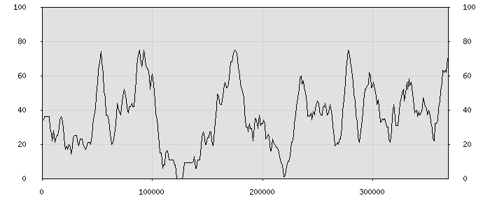 (по горизонтали: счётчик знаков; по вертикали: процент диалогов; размер скользящего окна: знаков, шаг: 1000 знаков) |