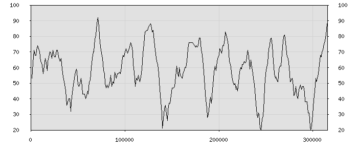 (по горизонтали: счётчик знаков; по вертикали: процент диалогов; размер скользящего окна: знаков, шаг: 1000 знаков) |