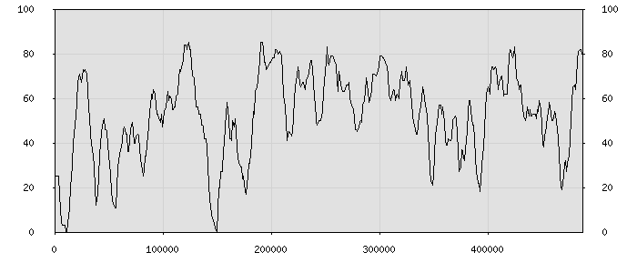 (по горизонтали: счётчик знаков; по вертикали: процент диалогов; размер скользящего окна: знаков, шаг: 1000 знаков) |
