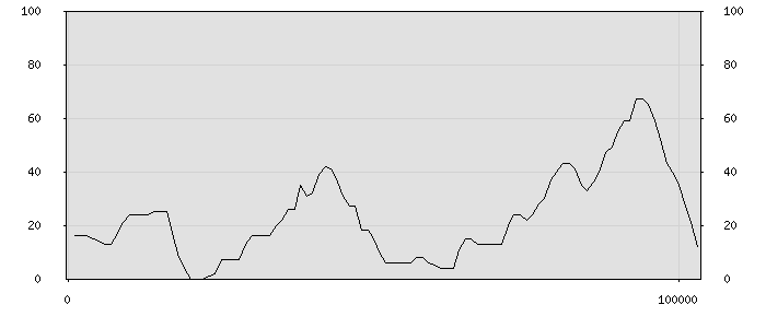 (по горизонтали: счётчик знаков; по вертикали: процент диалогов; размер скользящего окна: знаков, шаг: 1000 знаков) |